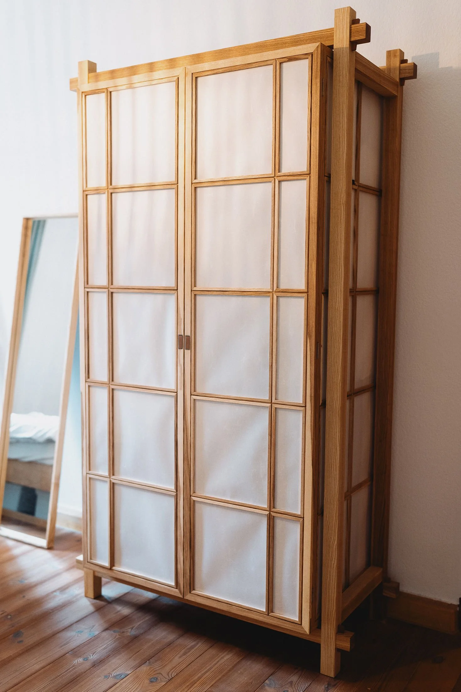 Mit seiner filigranen, aber stabilen Bauweise vereint der Kleiderschrank traditionelles Handwerk und modernes Design. Die vielen klassischen Holz- und Steckverbindungen zeugen von hoher Handwerkskunst, die in jedem Detail spürbar ist. Das individuell verstellbare Innenleben sorgt für maßgeschneiderte Funktionalität, während das edle Shoji-Papier und das helle Eschenholz dem Schrank eine zeitlose Eleganz verleihen. Ein Unikat, das durch seine Liebe zum Detail und die sorgfältige Handarbeit zu einem echten Hingucker wird.